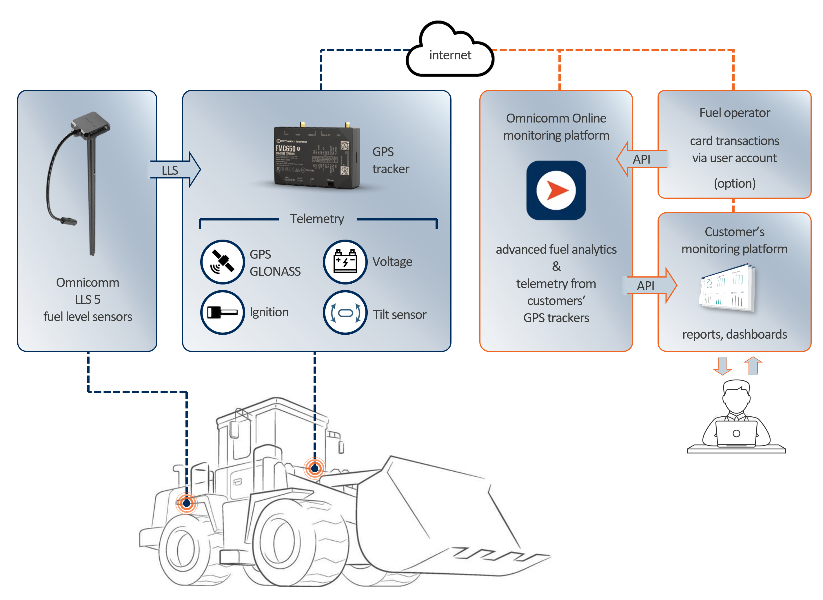 | OMNICOMM LLS 5 fuel level sensors are exceptionally robust, extremely precise (99.5% accuracy), totally reliable (highest possible ingress protection rating of IP69k) and super-safe. They deliver consistently high accuracy in even the harshest conditions. This sensor is ideal for both vehicles and stationary fuel storage facilities, guaranteeing seamless operation and maximum economic efficiency. OMNICOMM LLS 5 using unique fuel analysis technology FUELSCAN® developed by OMNICOMM which compares the physical characteristics of filled fuel with the characteristics of the fuel used for calibration to introduce a correction coefficient that automatically adjusts sensor readings to deliver accurate measurements. It means that no additional calibrations will be required. |
