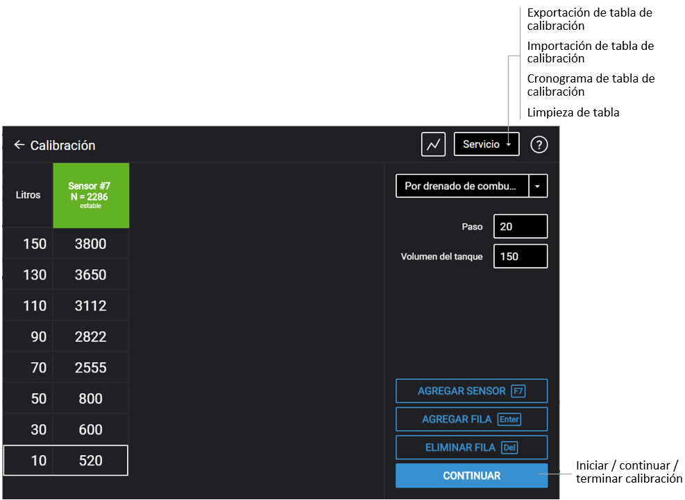 El valor igual al volumen de llenado se mostrará en la columna “Sensor”.