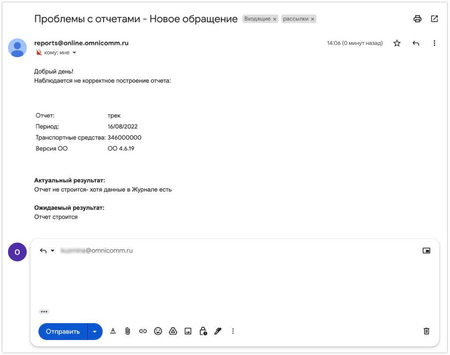 При нажатии кнопки «Ответить» автоматически устанавливается адрес, указанный клиентом при отправке обращения: