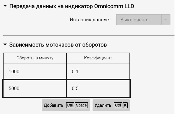 При выборе «Моточасы по оборотам» заполните таблицу пересчета оборотов в моточасы следующим образом: